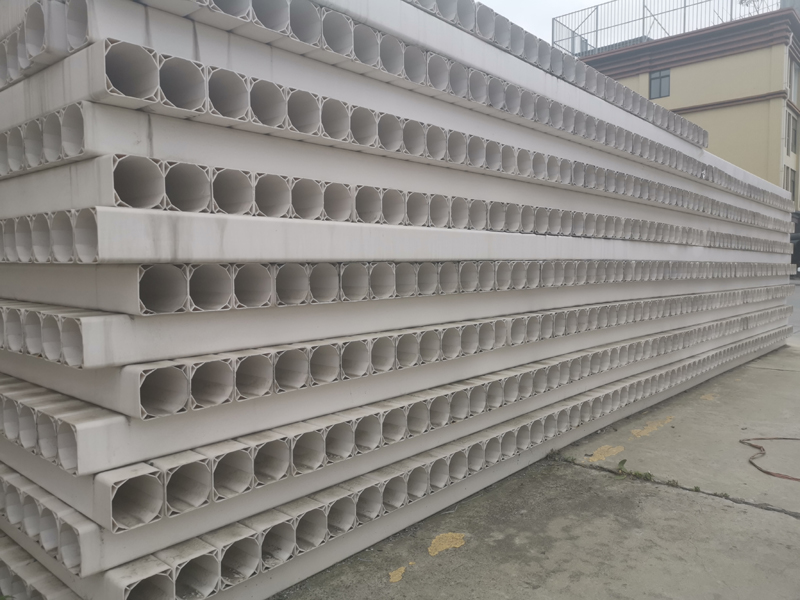 PVC 多孔管屬柔性塑料管, 白色, 材料為硬聚氯乙烯,常用的是七孔梅花管和七孔蜂窩管,其規(guī)格型號為 110 32 × 7。 PVC 多孔管采用承插式接口, 使用 PVC膠進(jìn)行密封防水處理, 具有水密性好